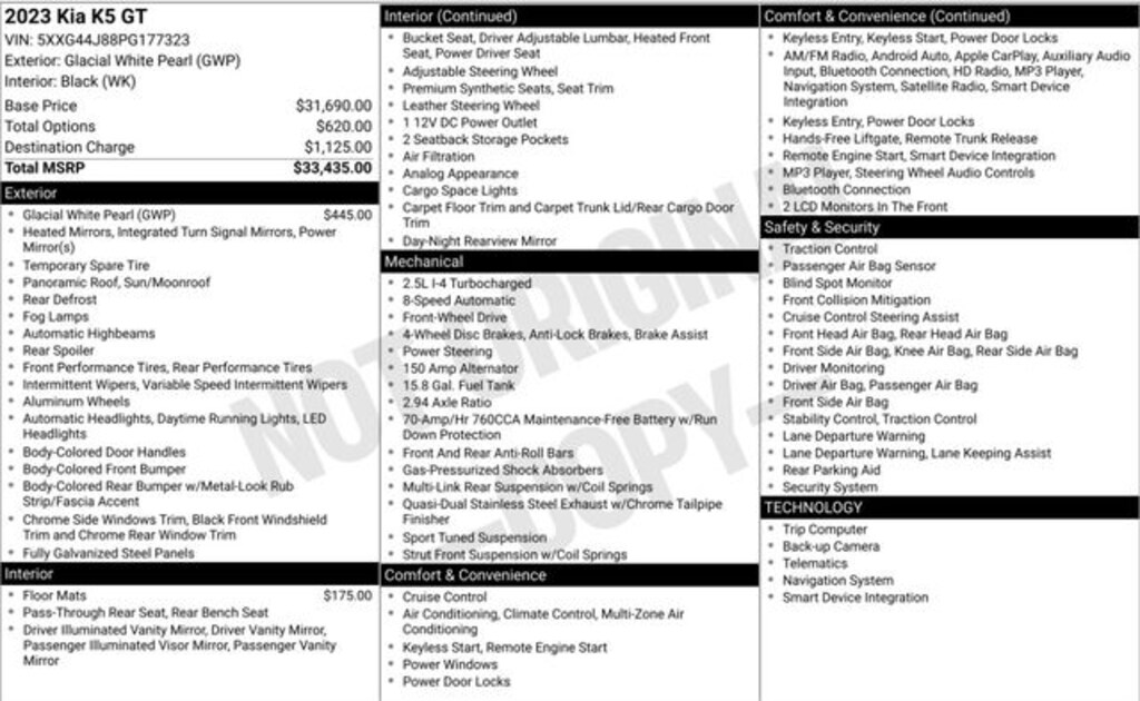 Glacial White Pearl 2023 Kia K5 GT FWD 8 Speed Dual Clutch 2.5L I4 DGI Turbocharged DOHC 16V LEV3-ULEV70 290hp **CLEAN VEHICLE HISTORY REPORT**, **LOCAL TRADE IN**, **ONE OWNER**, 6 Speakers, Heated Sport Bucket Seats, Low tire pressure warning, Navigation System, Occupant sensing airbag, Outside temperature display, Overhead airbag, Panic alarm, Rear reading lights, Rear seat center armrest, Rear side impact airbag, Split folding rear seat, Sport steering wheel.