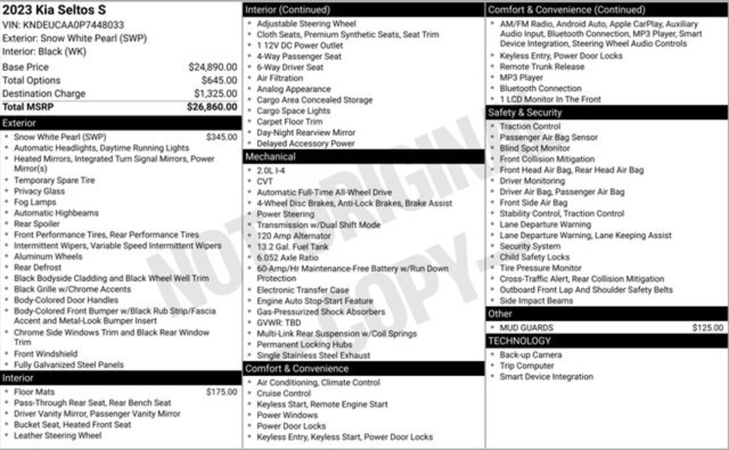 2023 Kia Seltos S Snow White Pearl AWD 2.0L I4 MPI